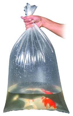 From moment of purchase get the pond fish to their intended new home as quickly as possible. Rinse the exterior of the bag the fish is in, pour off excess water from inside the bag leaving enough to comfortably cover the dorsal (back) fin of your fish, and place the bagged fish into the pond/aquarium. The bag should be kept open and folded back around the edges so it floats in the pond. At this point temperature acclimation begins.