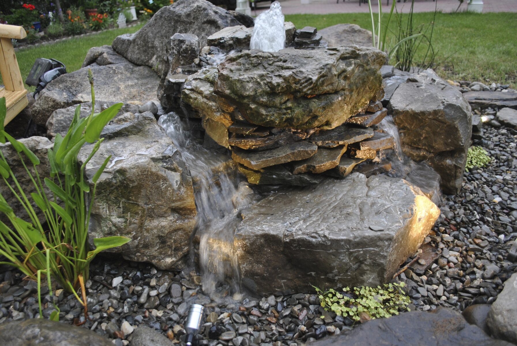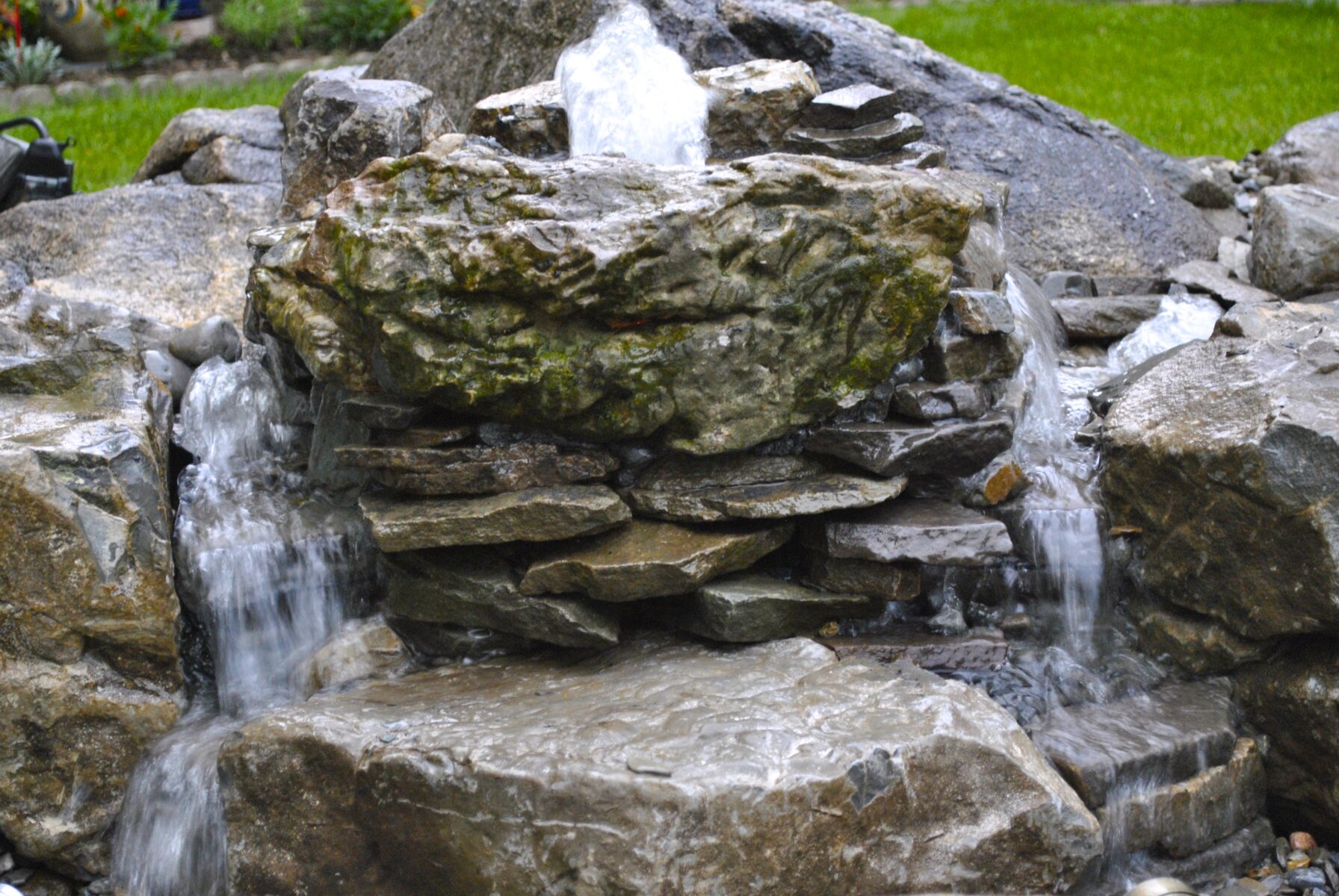 Although called a pondless waterfall this Milburn, NJ water feature is really a unique work of aquatic art. Multiple cascades visible from every angle in yard, make this the centerpiece of beautifully manicured landscapes.