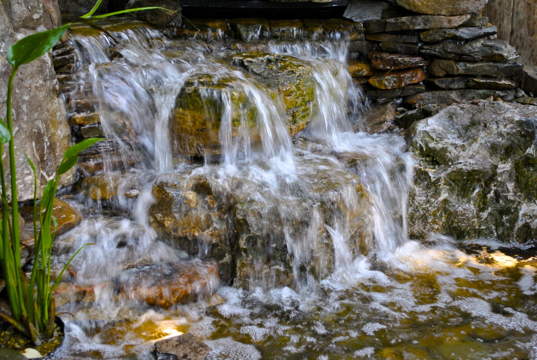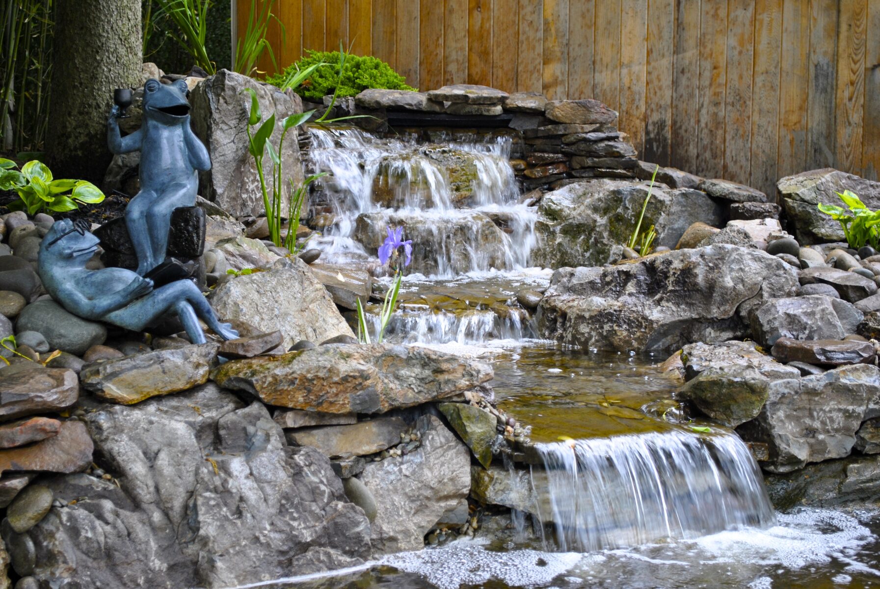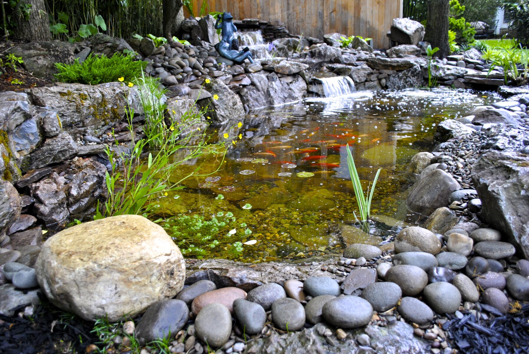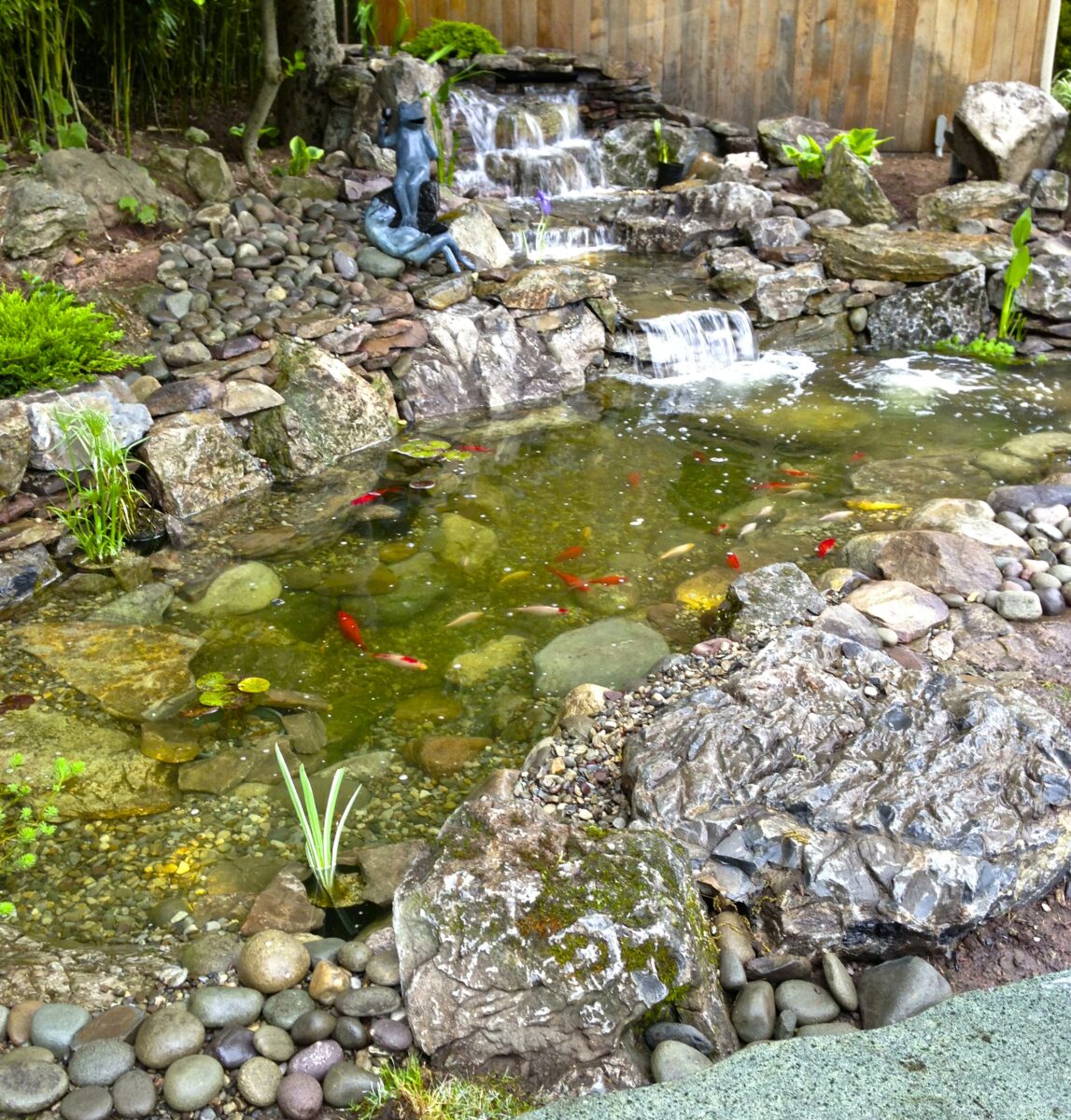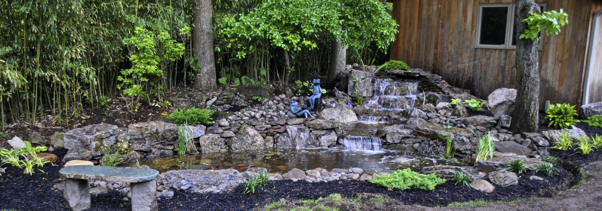 An amazing waterfall display is not all this West Orange, NJ koi pond installation offers. FSA installed seating as well as large boulders around the edge for real up close enjoyment of the pond installation.