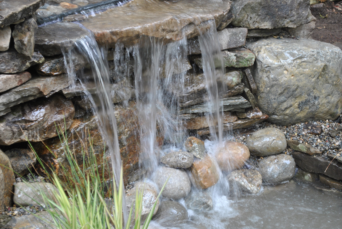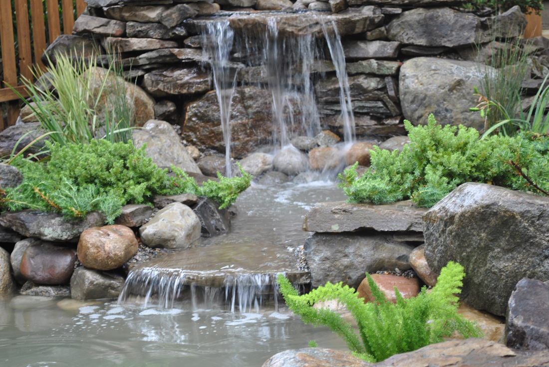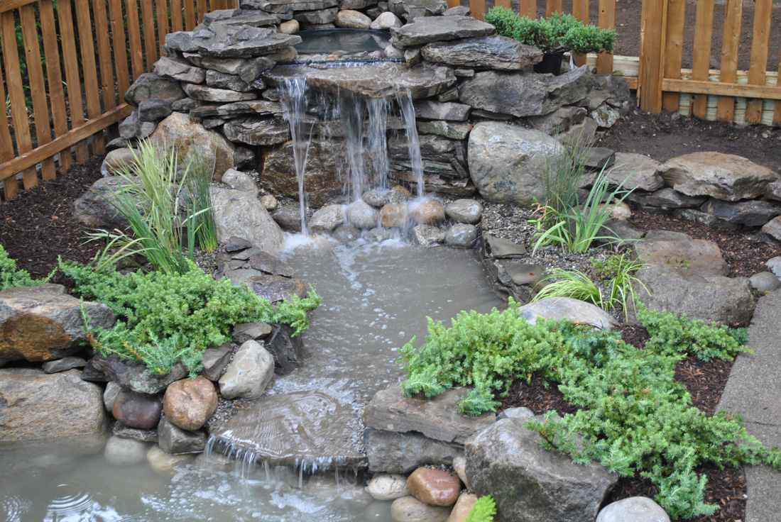 We took a somewhat confined and “vanilla” backyard and transformed it into a water garden paradise; complete with koi and landscaping. What a beautiful space that the whole family enjoys from the pond side seating area, or from the overlooking deck!