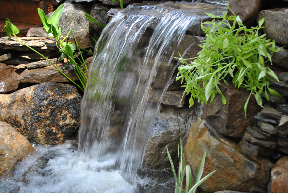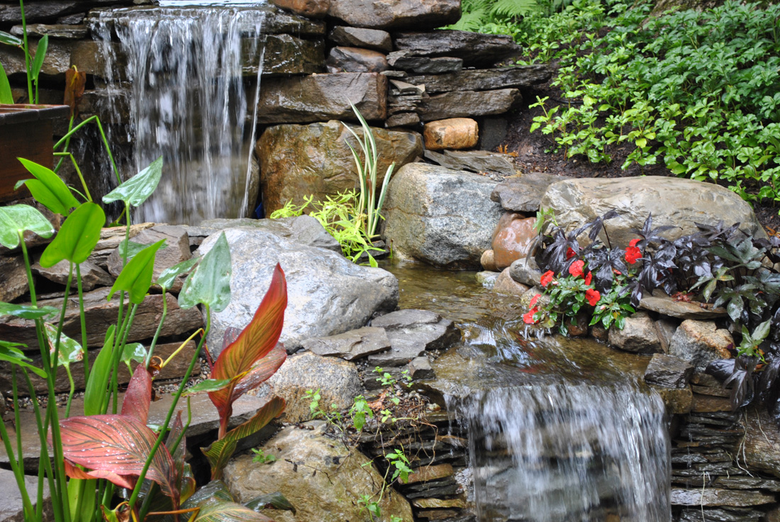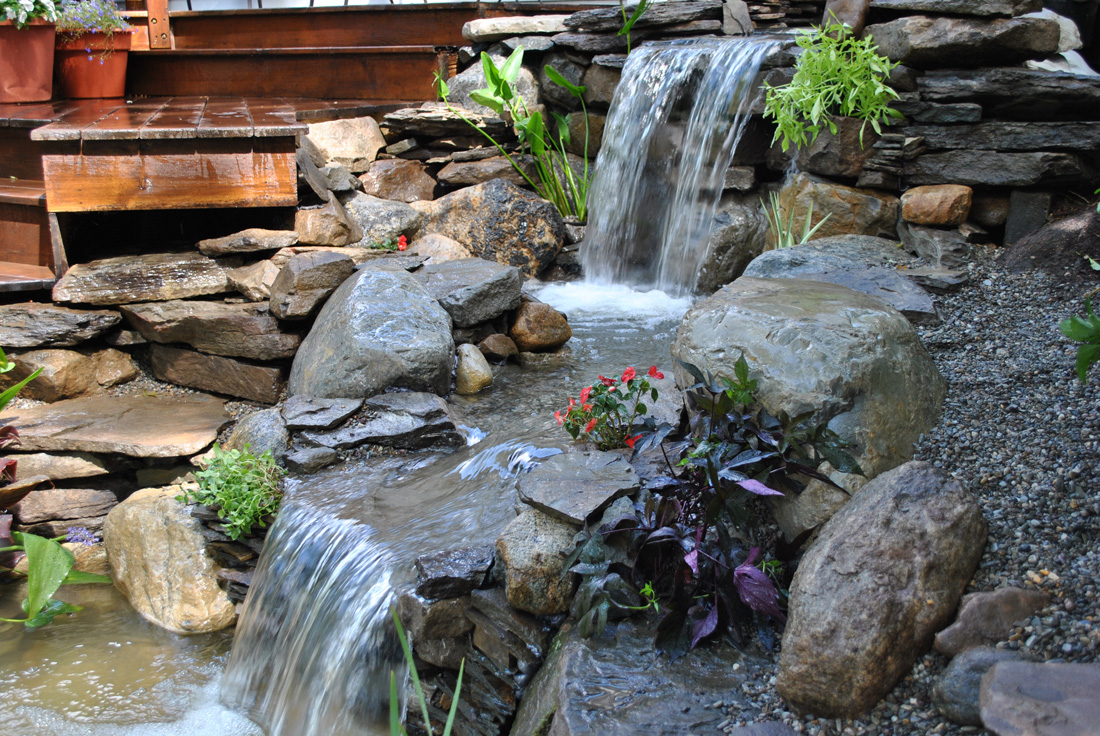 Small backyard pond with two stone waterfalls, wooden steps, surrounding plants, and blooming flowers.