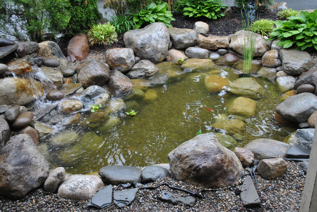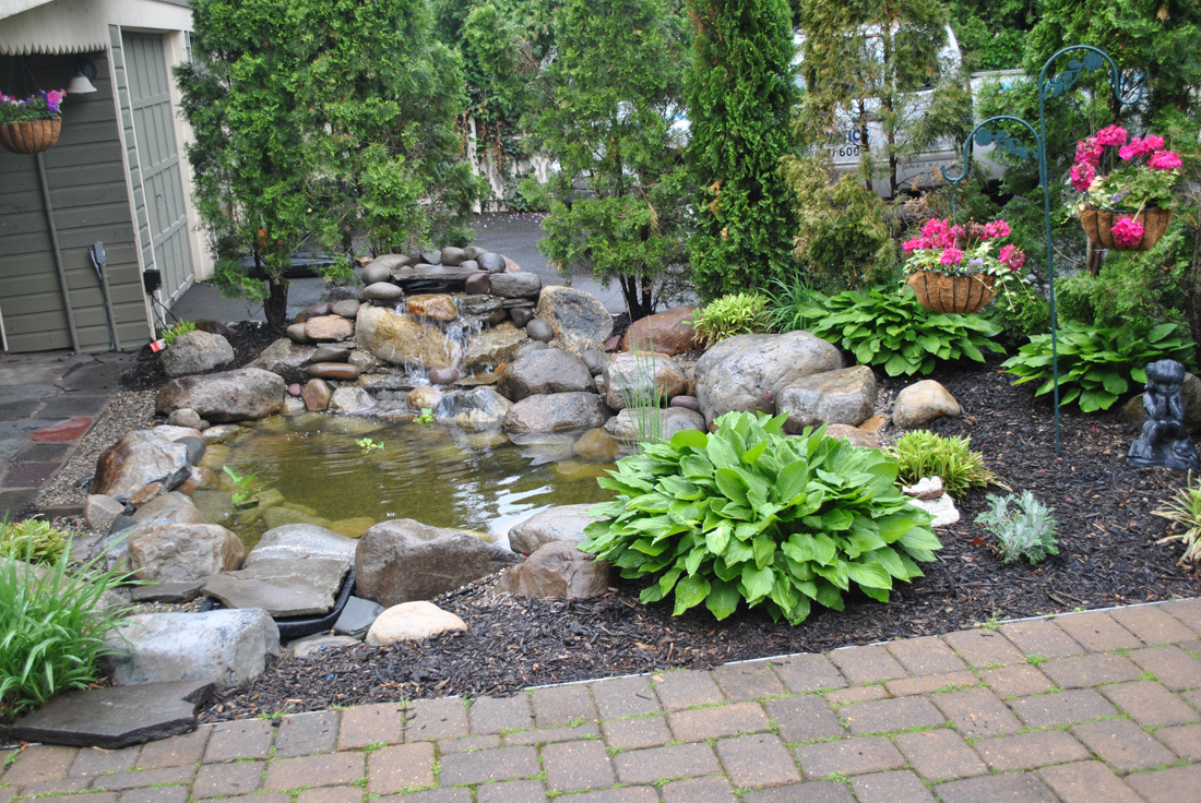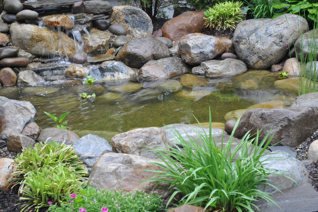 Small backyard pond with a stone waterfall feature, surrounded by rocks, green plants, and shrubs.
