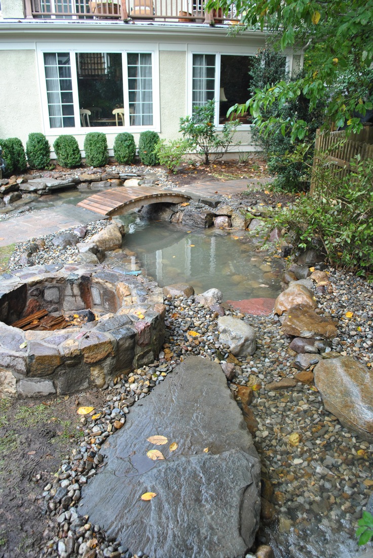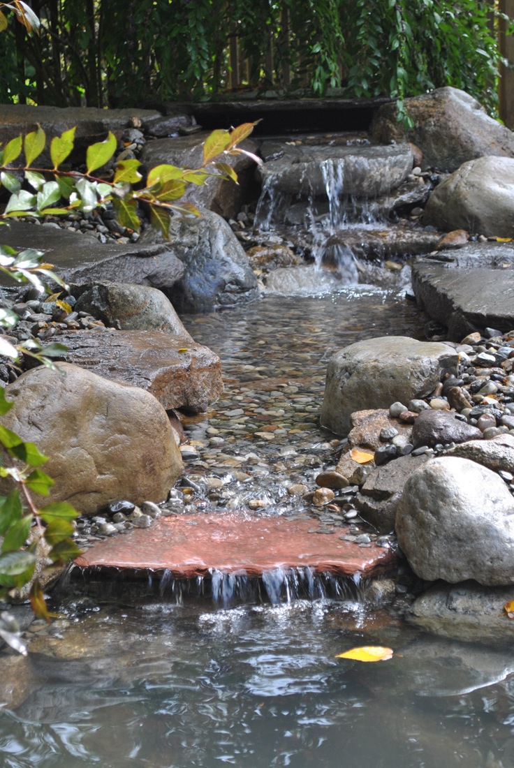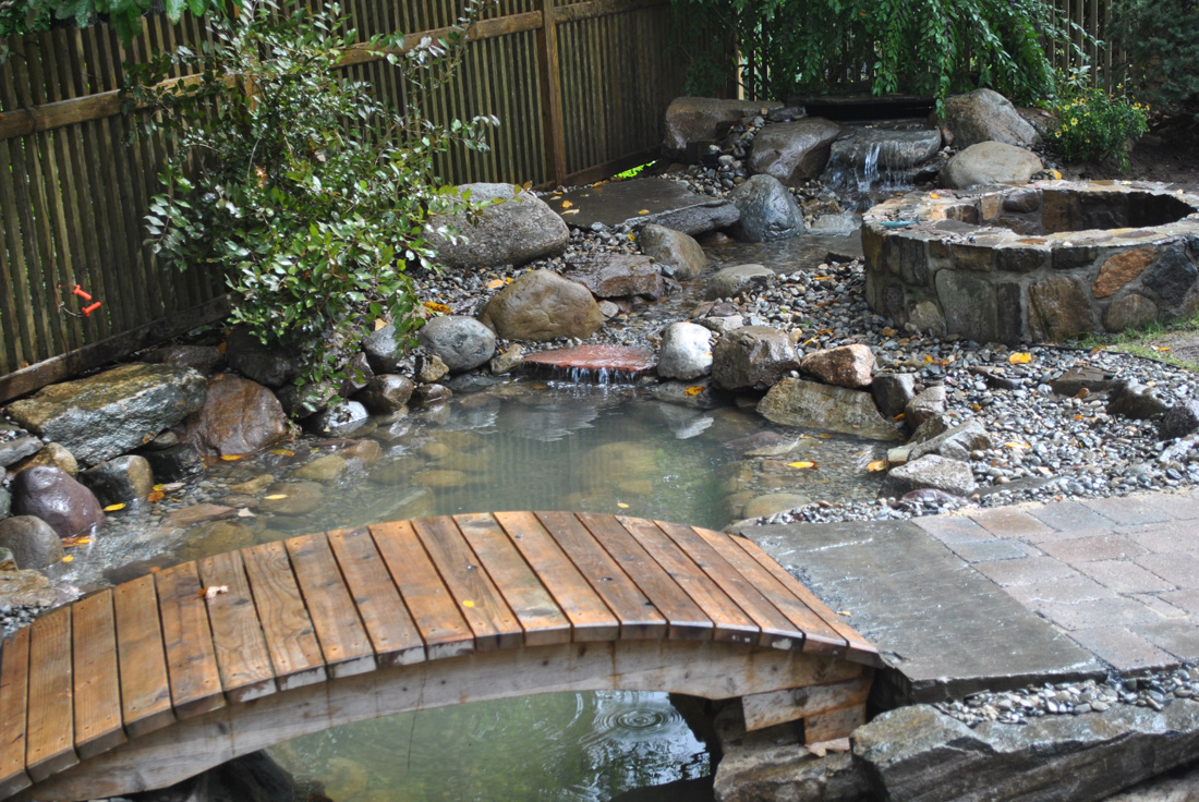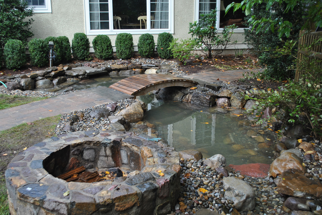 Staycation comes to mind with this backyard pond installation project. The pond and waterfall greet you at the entry to the backyard. As you cross the bridge over the pond you can choose to hang by the firepit and watch the stream meander by, take a swim in the pool, or Get a BBQ going while overlooking the pond from the deck! This pond was the perfect finishing touch!