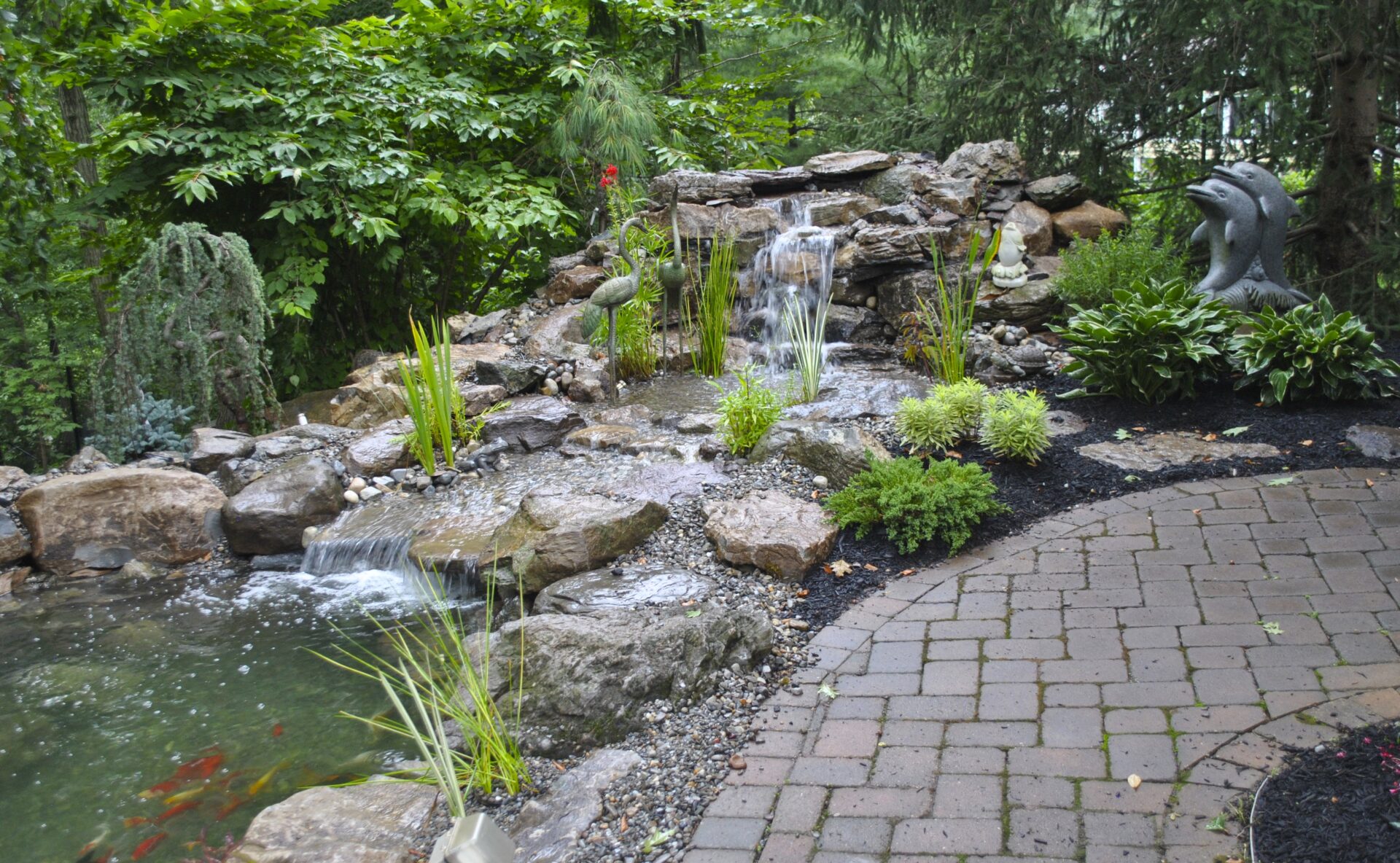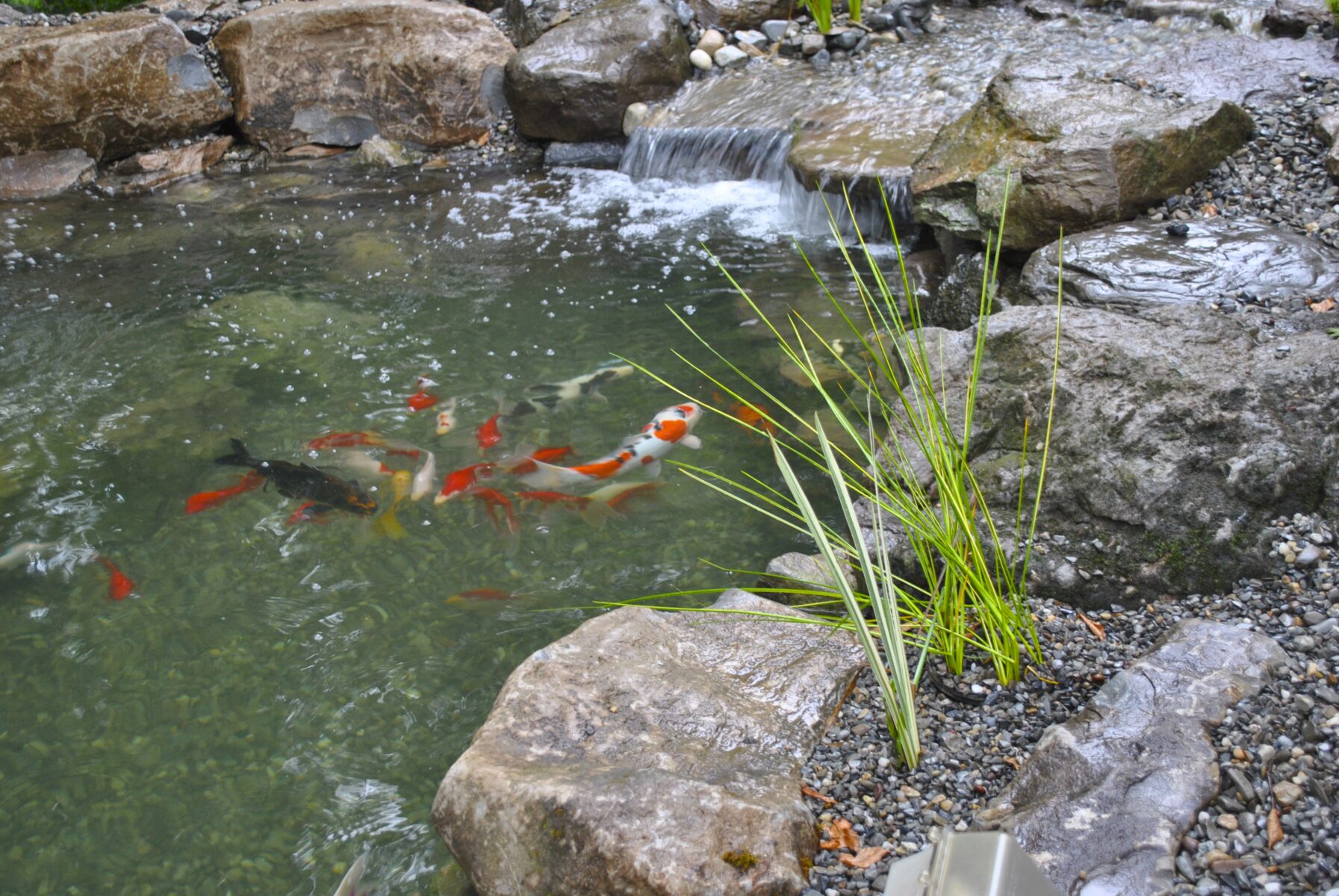 This koi pond in Warren, NJ was a pond renovation project. FSA made the pond bigger, deeper, and installed excellent filtration. The lighting on this pond create a dramatic night time display that the koi enjoy too!