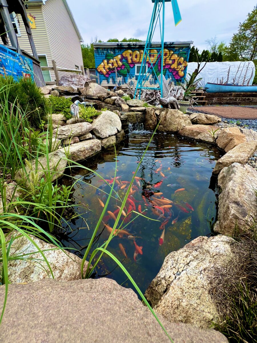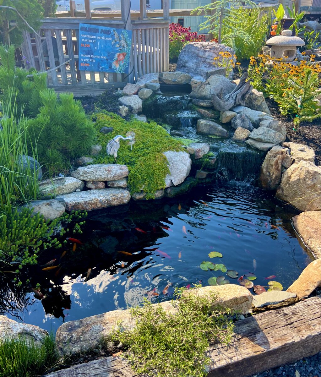Wanna smile? Check out the goldifsh pond at That Pond Place. Filled with happy friendly colorful goldfish. This display is for those interested in a smaller backyard pond. Equipped with complete pro-grade filtration system, and adorned with a waterfall display. This small pond has everything for the pond keeper with a smaller area, including pond plants and a fish cave.