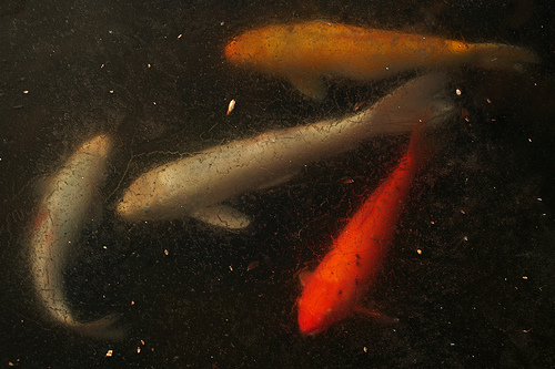 In short our fish are not up to too much under the ice and snow, sorry, but keep reading anyway. Our koi and goldfish not being up to too much is an interesting behavior, considering how lively they are throughout the rest of the year. For the most part they sit on the bottom of the pond in the “warmest” pocket of water they can find. During winter months the warmer water is on the bottom of the pond. During warmer months its inverses with colder water at bottom of pond and warmer water up top. I have often seen my koi lined up next to each other, evenly spaced, facing the same direction; as if they were in a parking lot! This funny behavior that may lead a pond keeper to think koi and goldfish are huddled together to share body heat; but koi are poikilothermic, so no. This behavior is probably a way to fit as many koi into that pocket of warm water as possible. In larger warm areas you’d probably see a more random formation of the koi, some facing this way and others facing that way.
